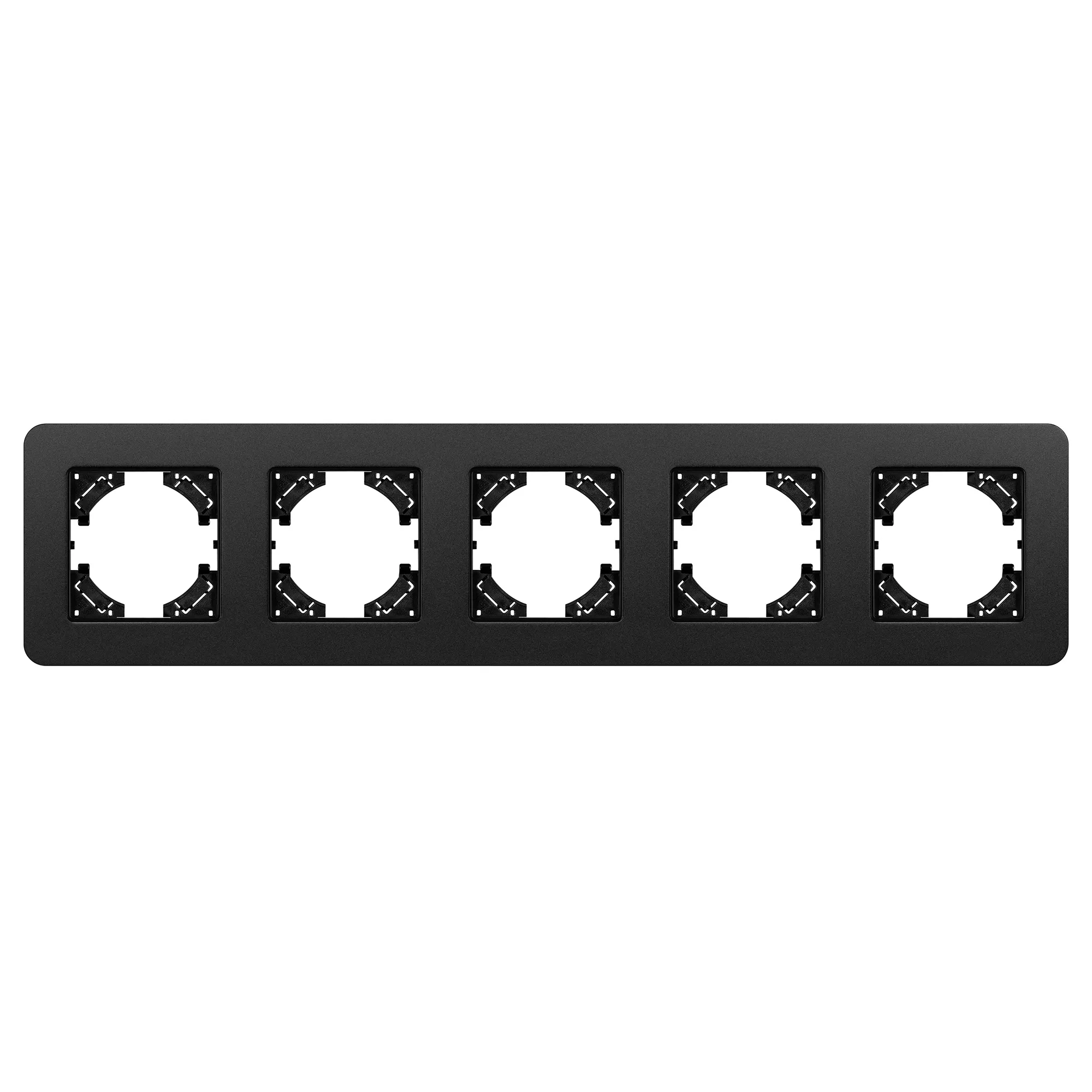 Рамка алюминиевая на 5 постов, под встраиваемый механизм. Цвет - черный с Soft-Touch покрытием. Уровень герметичности IP20. Ориентация монтажа - горизонтальная (основным ориентиром служат посадочные выступы для накладки механизма).