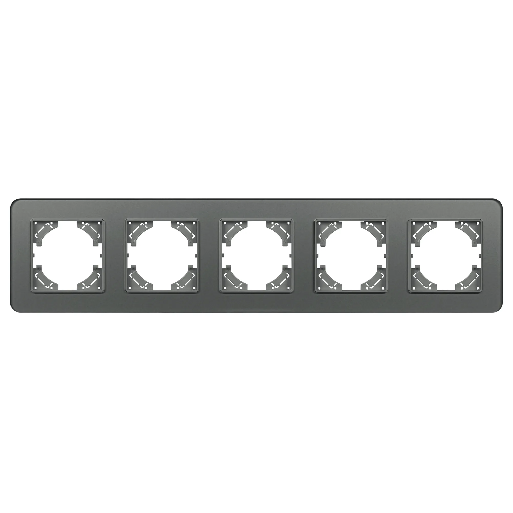 Рамка стеклянная на 5 постов, под встраиваемый механизм. Цвет - серый с Soft-Touch покрытием. Уровень герметичности IP20. Ориентация монтажа - горизонтальная (основным ориентиром служат посадочные выступы для накладки механизма).